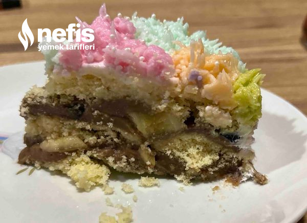 - Keki soğuduktan sonra istediğiniz formda kesin sütle ıslatın çok cıvık olmayacak halde iç kremadan sürün meyve ekleyin ikinci kat pandispanyayı koyun ıslatın pastanın her yerini astar kat krem şanti ile kaplayın bu kademede kırıntı bulaşamasını önemsemeyin dolapta dinlendirin.