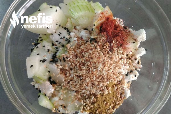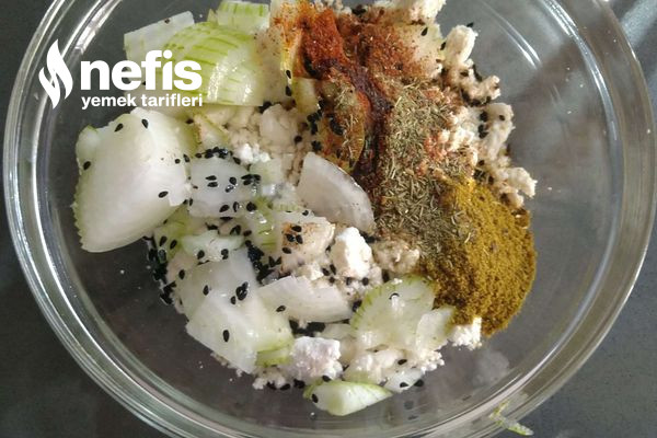 - Lor peyniri içine soğanı ince doğrayın, tüm baharatları atın ve zeytinyağını da katıp karıştırın.