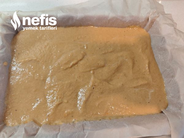 - Kek harcını yağlı kağıt serili yayvan bir kalıba yayın. İsterseniz üzerine file badem serpin.