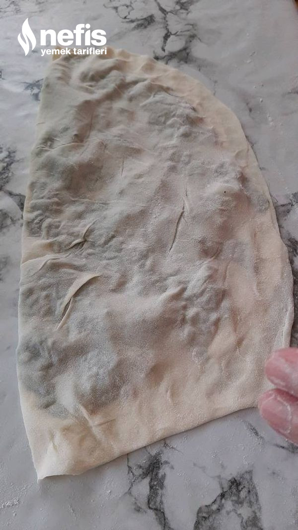 - Dinlenen hamurumuzdan ufak bezeler elde edip açmaya başlayalım. Hafif unlanmış tezgah üzerinde bezeleri oklava yardımıyla tabak büyüklüğünde açın. Hamuru incecik açın ve fazla ununu elinizle hamurun üzerinden alın.