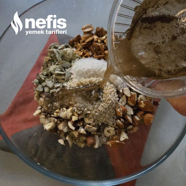 - Tepside soğumaya bırakın soğuyan granolayı kavanoza koyup, sıkıca kapatın. Afiyet olsun.