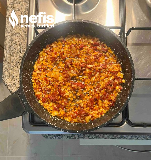 2. Soğanı yemeklik doğrayıp sıvı yağ ile kavurun. Kavrulan soğanların üzerine salçayı ekleyip birkaç dakika daha kavurun.