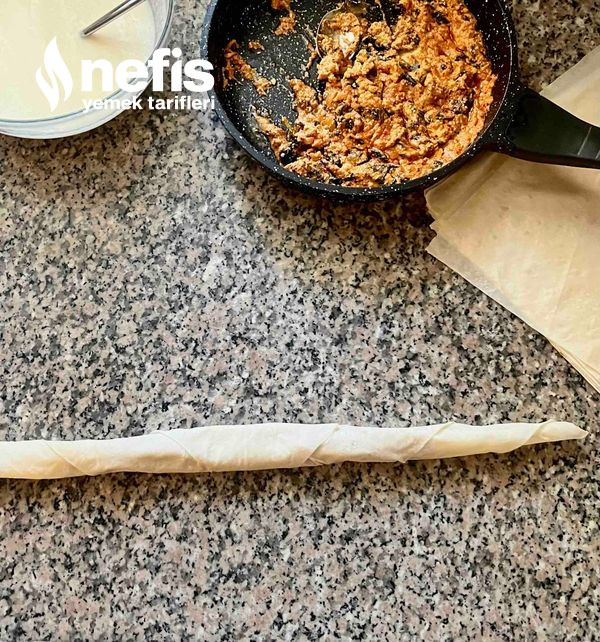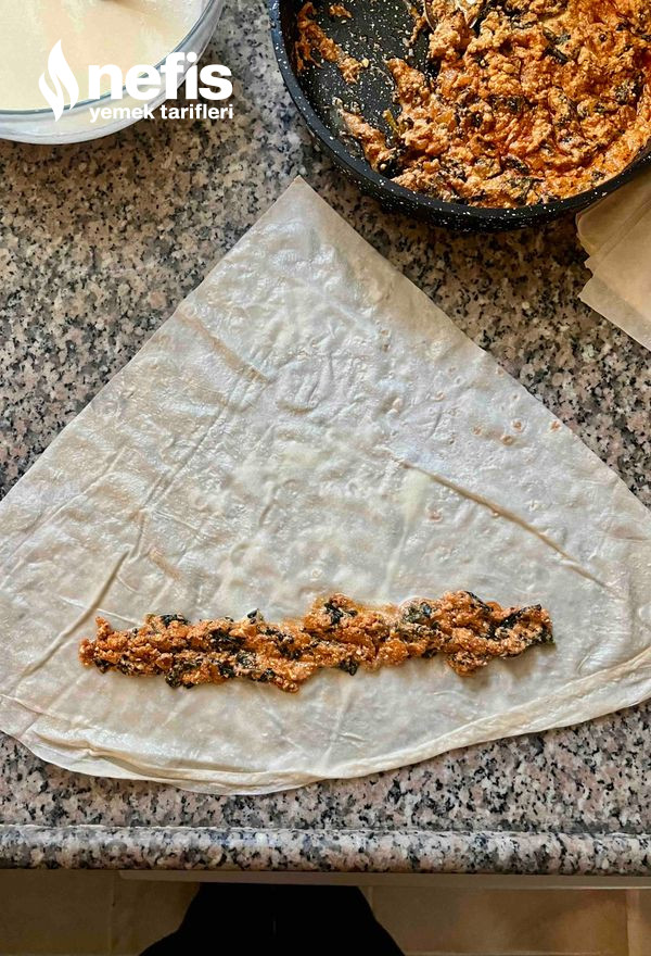 7. Yufkanın üzerine ıspanaklı peynirli harcı şerit halinde yerleştirin. Rulo biçiminde sarıp bir ucundan içe yanlışsız kıvırarak gül hali verin.