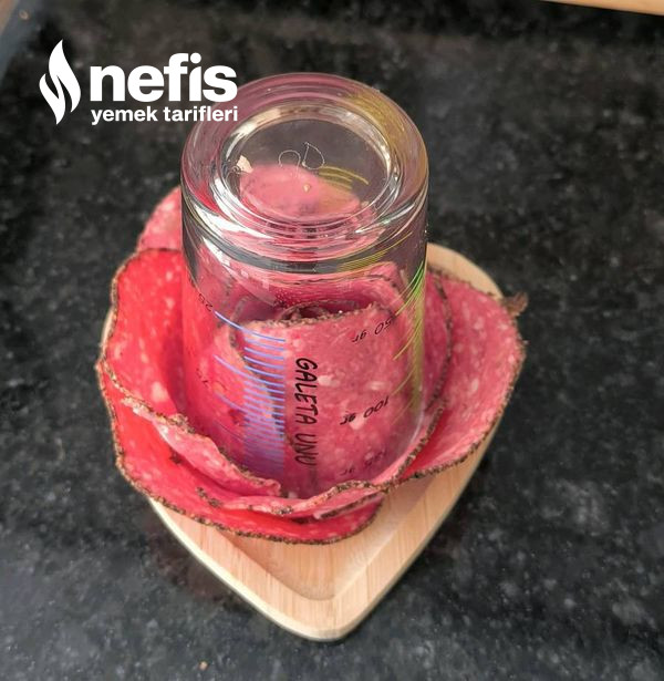 1. Bir su bardağına salam dilimleri fotoğraftaki üzere konulur. Üzerine tekrar salam dilimleri konulur. Bardak aksi çevrilir form oluşur. Afiyet olsun 🩷