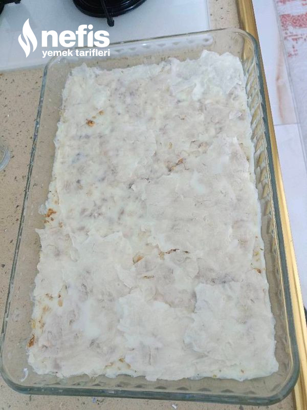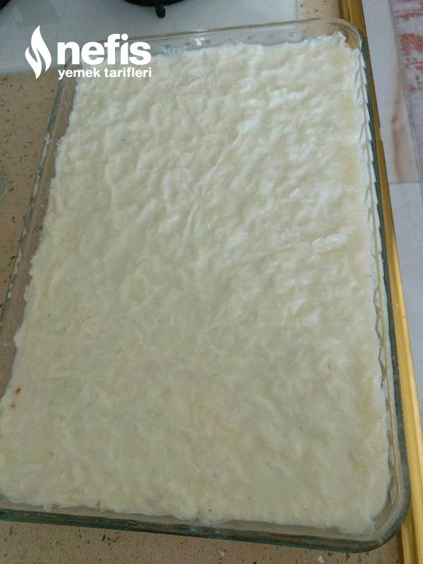 - Tepsimize evvel biraz süt daha sonra bir yaprak güllaç yerleştirelim. Her kattan sonra kepçe ile bastırarak sütün üste çıkmasını sağlayalım. Bu evrede yaprakların parlak yüzü üste gelmelidir.