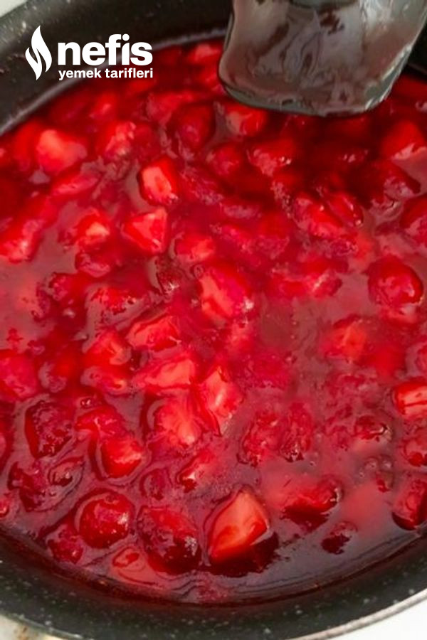 - Sosu için; uygun bir tencereye tencerede tereyağı eritilir, üzerine çilek ve şeker eklenip suyunu salıncaya kadar pişirilir akabinde su ile açtığımız nişasta eklenip yoğunlaşıncaya kadar pişirilip, soğumaya bırakılır.