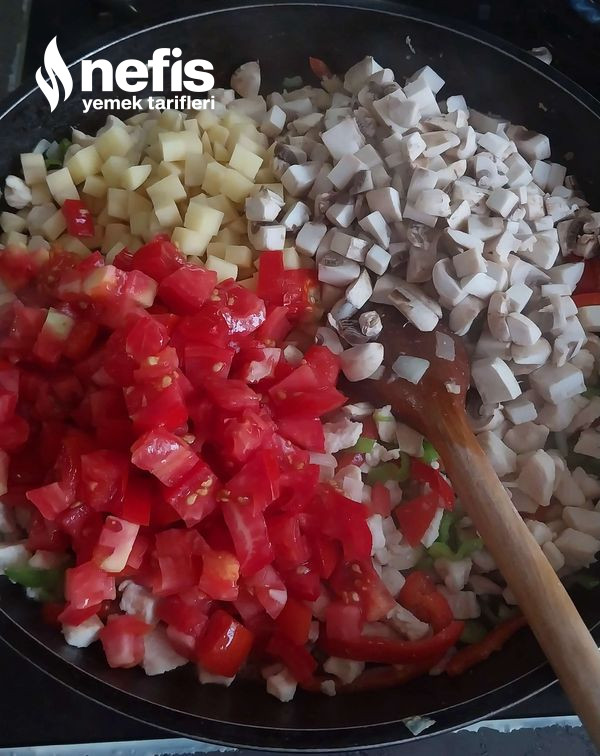 3. Biraz sonra küp küp doğradığımız patates, domates ve mantarlarıda tavamıza alarak bütün materyalleri güzelce kavuralım.