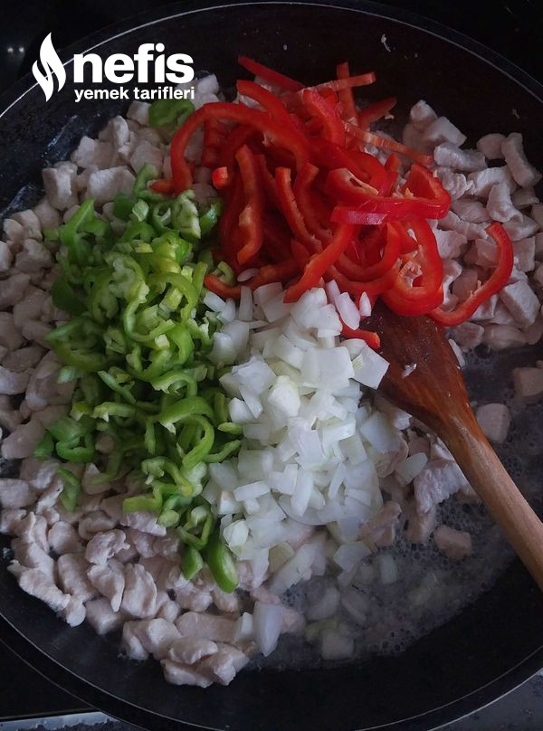 2. Ardından doğradığımız kapya biber, yeşil biber ve soğanıda tavaya alarak soteleme sürecine devam edelim.
