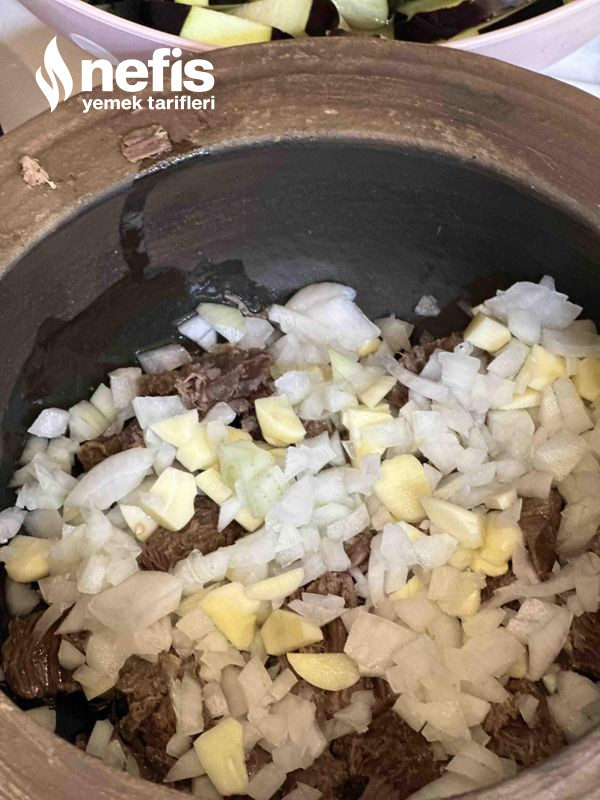 - Önceden düdüklü tencerede haşladığımız kuşbaşı eti güvecimizin en altına koyuyoruz.