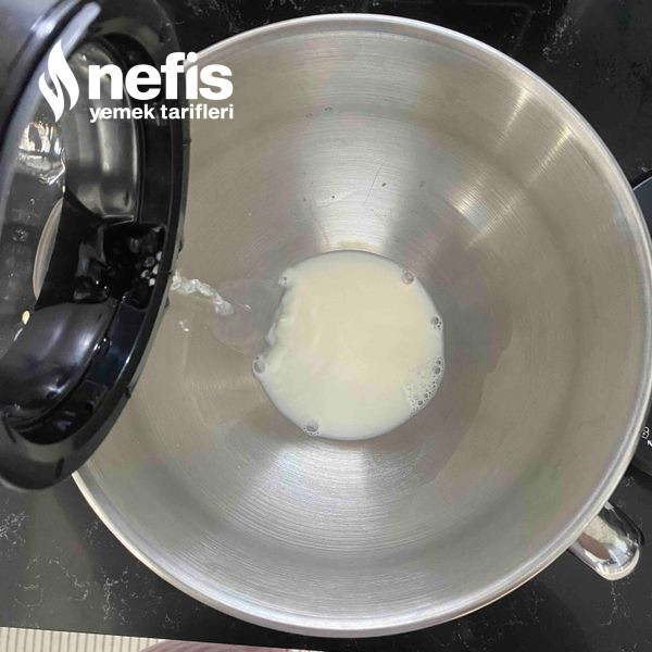 1. Yoğurma kabımıza sütümüzü ve suyumuzu üzerine maya, tuz,şeker ve yumurtamızı koyuyoruz güzelce karıştırıyoruz.