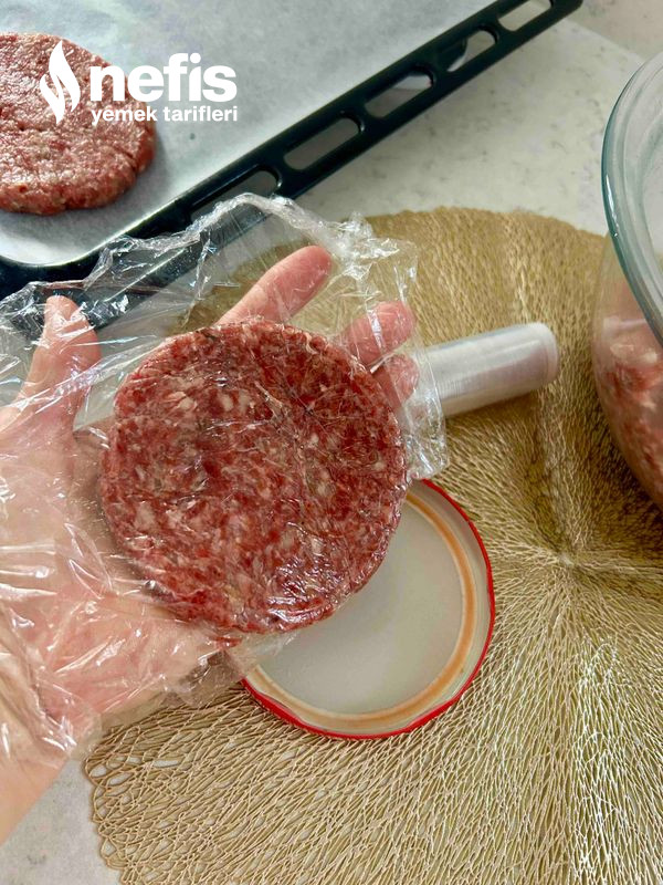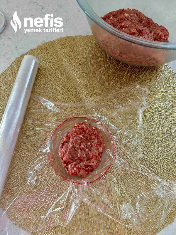 - Yumurta büyüklüğünde modüller koparalım kavanoz kapağına streç sinema serelim ve bu kapağın içerisinde bastırarak hamburger köftesinin halini verelim ,ters çevirip yuvarlak biçimli köftemizi çıkaralım tüm harcımızı bu formda hazırlayalım.