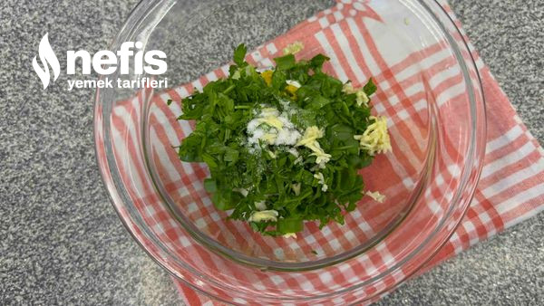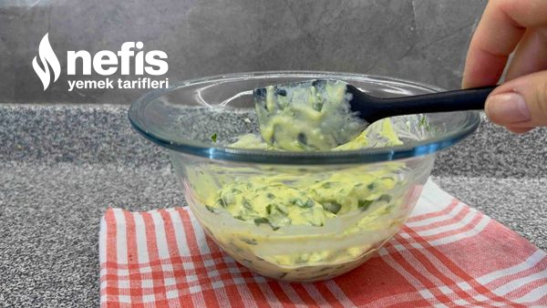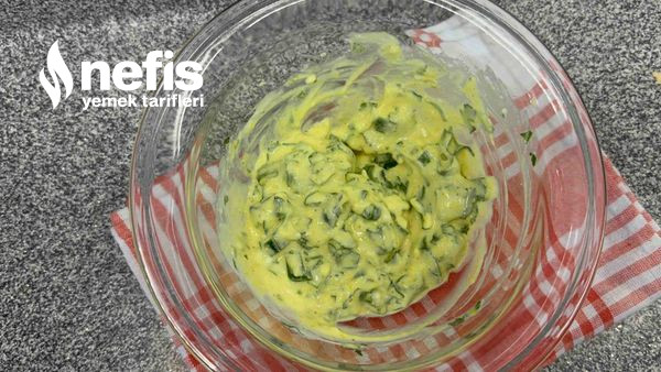 - Sos için yoğurt, hardal, taze soğan, maydanoz,tuz, sarımsak karıştırıp tabağın alt kısmına sosu yayalım. İsteğe bağlı sos içerisine mayonez de katabilirsiniz.