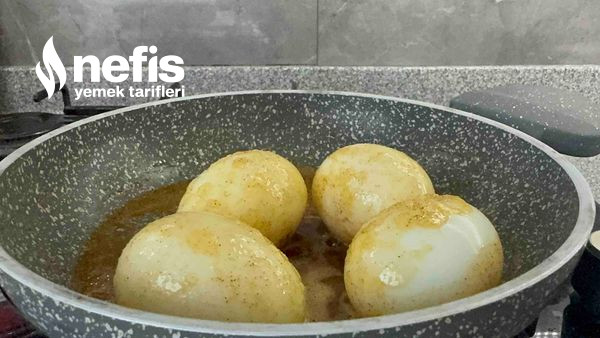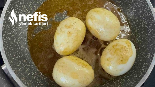 - Haşlanmış yumurtaları soyup, tavada tereyağını eritelim, içerisinde kırmızı toz biber kızdırıp yumurtaları bütün formda üzerine alıp döndürelim.