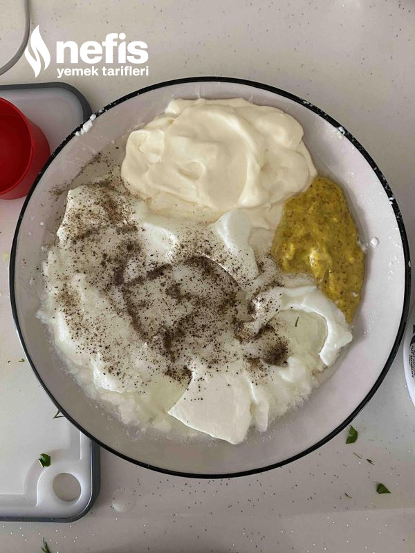 5. Beklerken öteki yandan sosu için yoğurt hardal ve mayonezi en son karabiber ekleyerek karıştıralım.