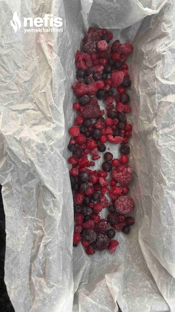 2. Sonrasında kullanacağımız kalıbımıza yağlı kâğıt serip orman meyvelerimizi yerleştiriyoruz.