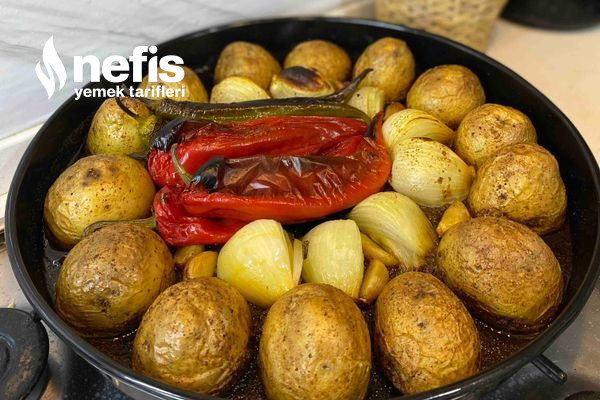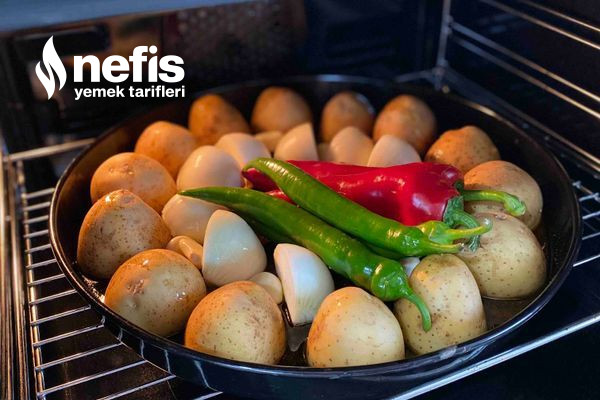 2. İçerisine kabuklarını soymadan ikiye böldüğünüz patatesleri üzerine bıçakla delik açtığınız biberleri, 4e böldüğünüz soğanları ve sarımsakları ekleyip tabanındaki yağı fırça ile sebzelere sürün.