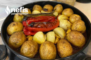 2. İçerisine kabuklarını soymadan ikiye böldüğünüz patatesleri üzerine bıçakla delik açtığınız biberleri, 4e böldüğünüz soğanları ve sarımsakları ekleyip tabanındaki yağı fırça ile sebzelere sürün.