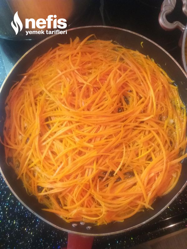 - Geniş bir tavaya sıvı yağ alınıp ince ince doğranmış havuçlar ve sarımsak beraberce uygunca kavrulur.