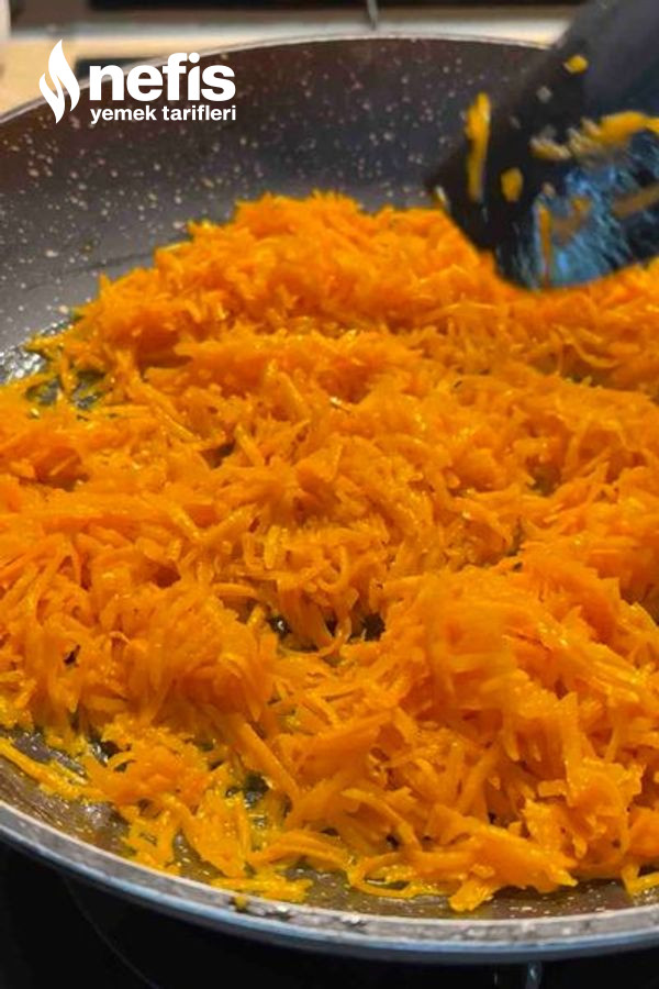 3. Bir tavaya zeytinyağını alın, üzerine rendelenmiş havuçları ekleyin.