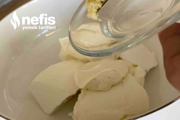 5. Bir kaba süzme yoğurdu, mayonezi, ezilmiş sarımsağı ve tuzu alın. Karıştırın.