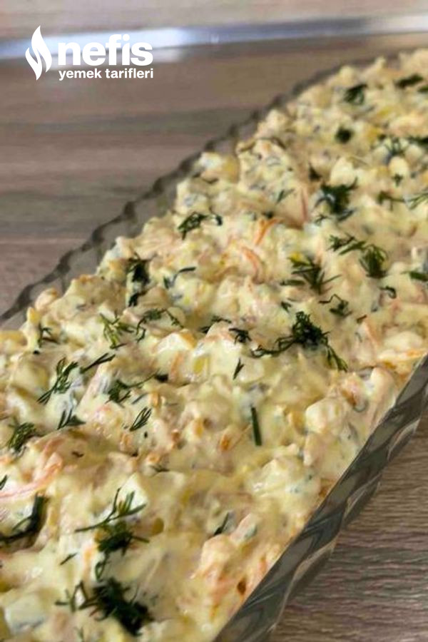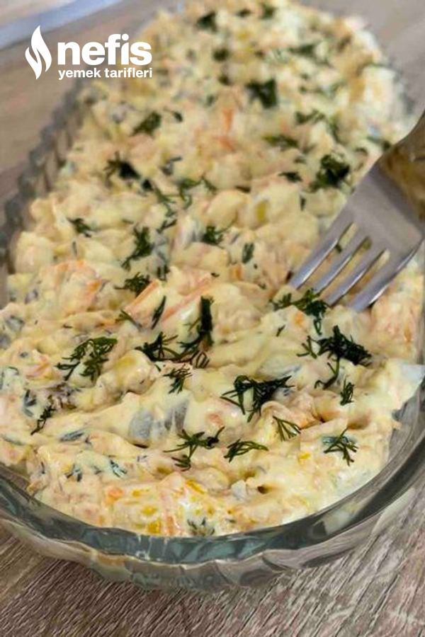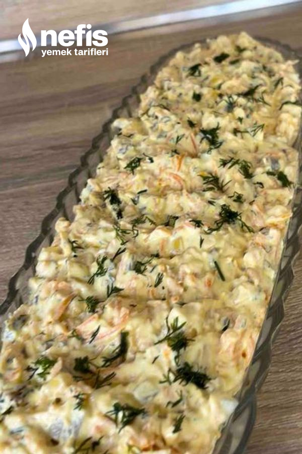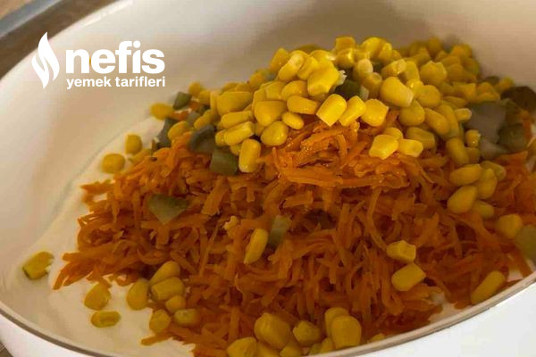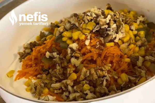 6. Diğer materyalleri ekleyin: karışıma soğuyan havuçları, doğranmış kornişon turşuyu, haşlanmış mısırı, cevizleri ve dereotunu ekleyin. Güzelce harmanlayın.