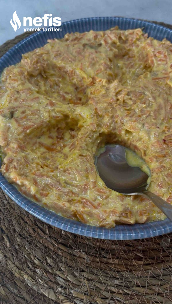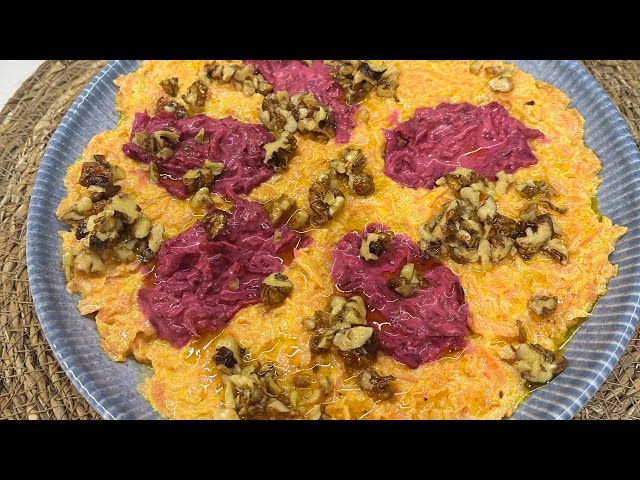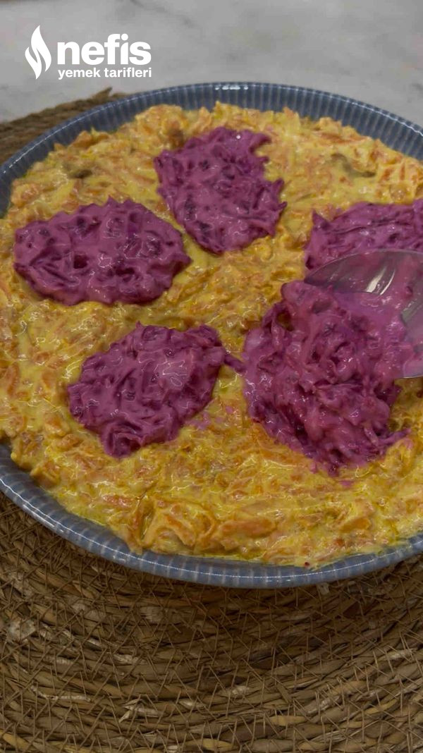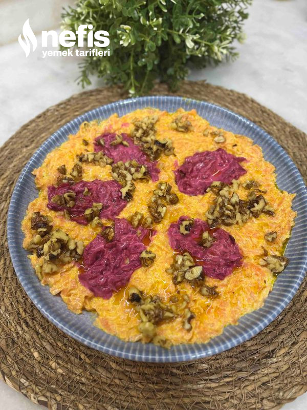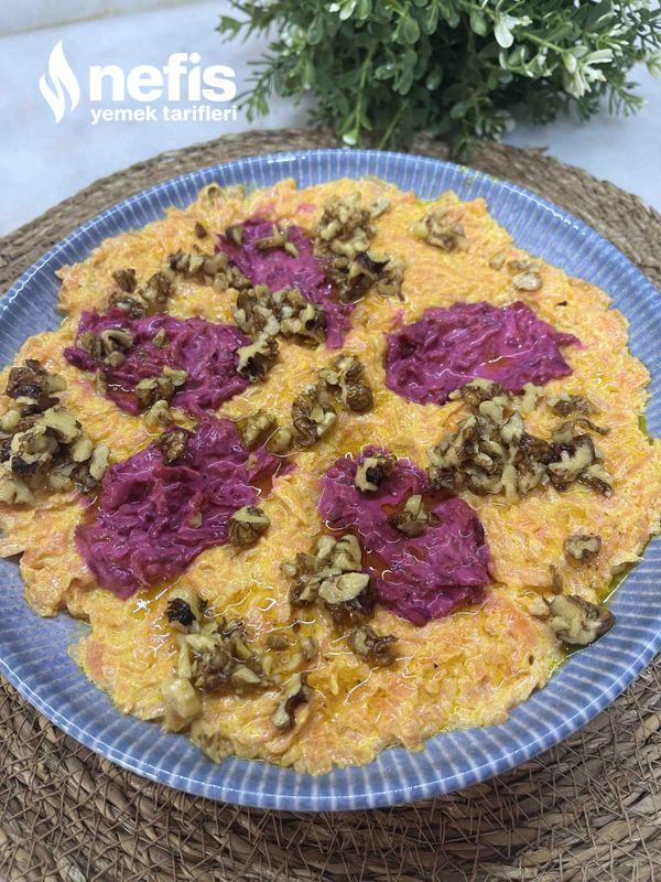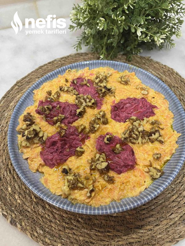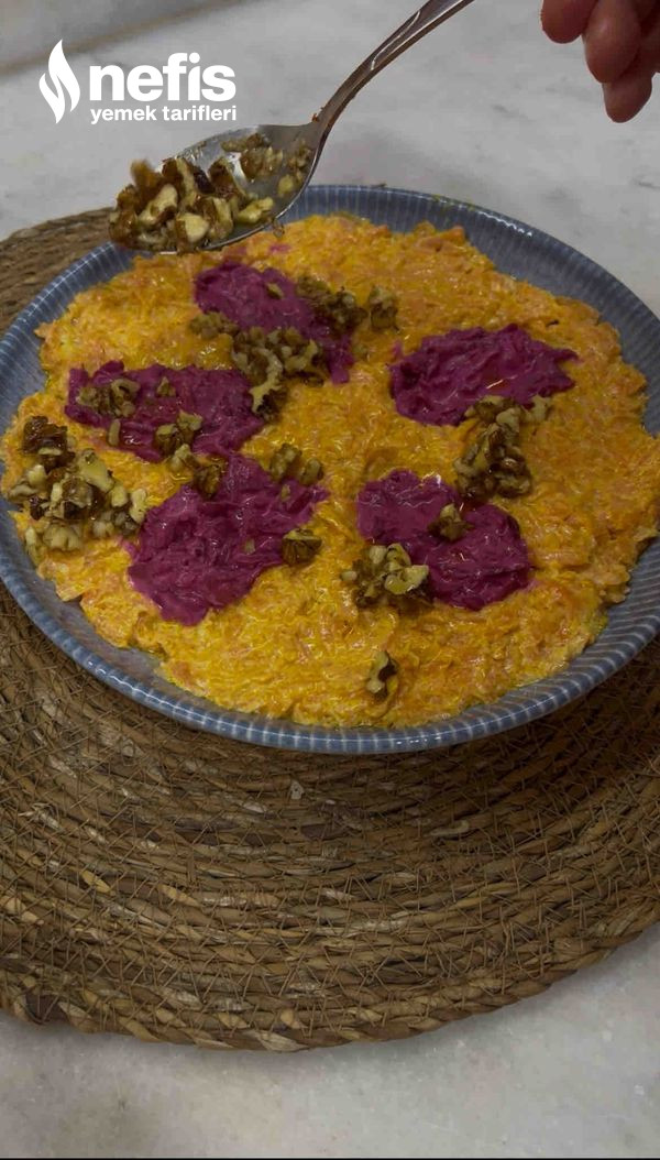 - Servis kabına yoğurtlu havucu döküp,yemek kaşığıyla bastırıp biçim verip,oyuk kısımlara pancarlı karışımı ekleyip üzerine tereyağında kavurduğumuz cevizleri döküp servis edelim.