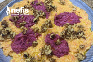 - Servis kabına yoğurtlu havucu döküp,yemek kaşığıyla bastırıp biçim verip,oyuk kısımlara pancarlı karışımı ekleyip üzerine tereyağında kavurduğumuz cevizleri döküp servis edelim.