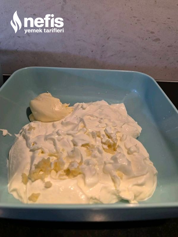 5. Sosunu hazırlıyalım: yoğurdu, mayonezi ve rendelenmiş sarımsağı çırpma teliyle çırpın.