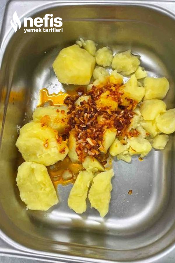 - Haşlanmış patatesin içine karıştıralım. Soğumaya bırakalım.