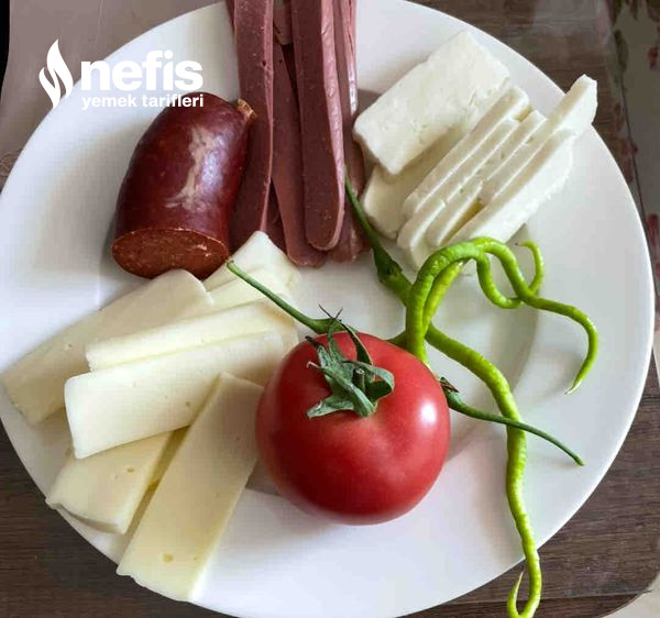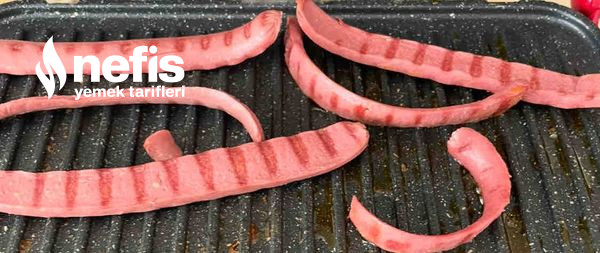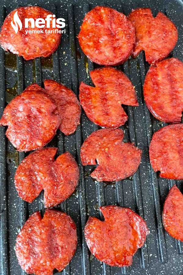 4. Pişirilen sucuğu kaşarın üstüne, sucuğun üstüne de pişirilen hellim peynirini koyalım. Son olarak en üste pişirilen sosisi yerleştirelim.