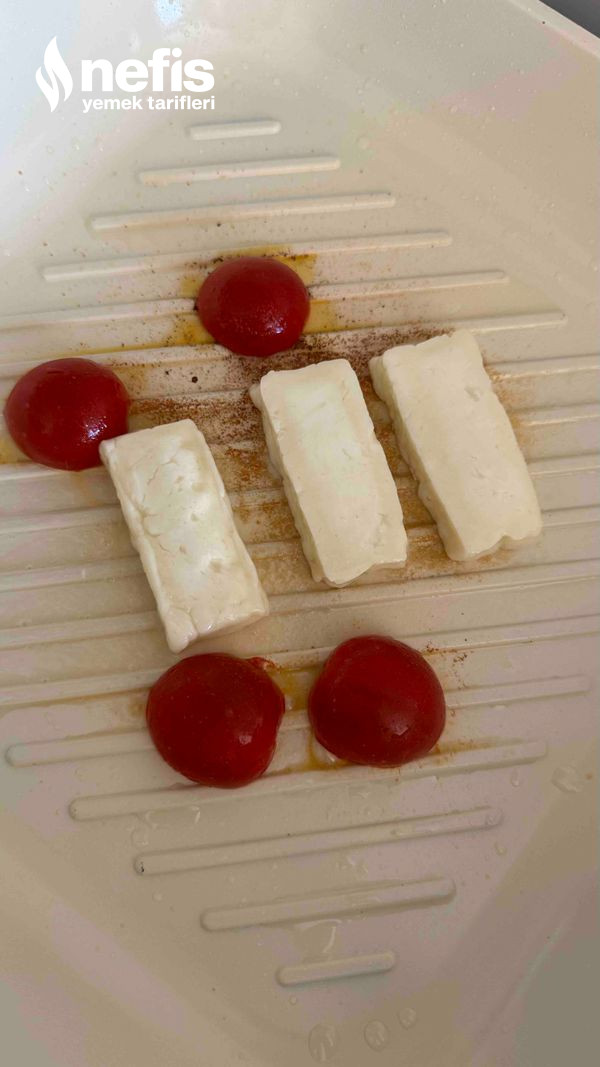 - Tavada zeytinyağı ısıtın, hellim peyniri ve ikiye kesilmiş domatesi ekleyin üzerine kuru nane ve fesleğeni serpin, iki taraftan kızartın.