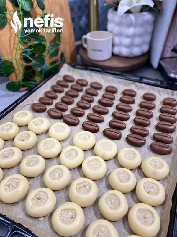 - Kakaolu hamuru bir parmağın yarısı kadar olacak biçimde kahve çekirdeği biçiminde yuvarlayın. Ortasına kürdanla çizik atın.