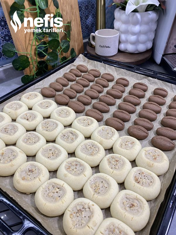 - Sade olan hamuru ceviz büyüklüğünde yuvarlayın. Ortasını çukur yapın. İçine çay kaşığıyla tahin koyun. Üzerine az toz şeker ve fındık serpin.