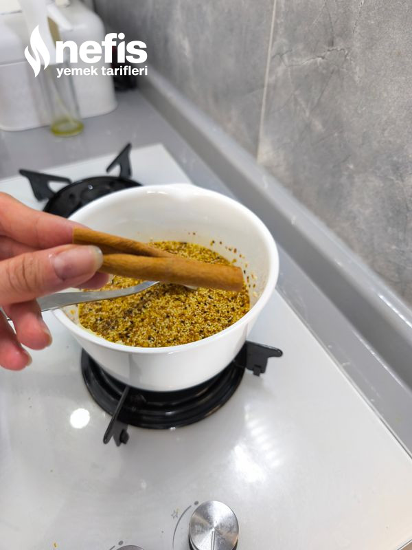 - Tarçın ve defne yaprağı ekleyip 1-2 dakika kokusunu verene kadar bekletip çıkaralım.