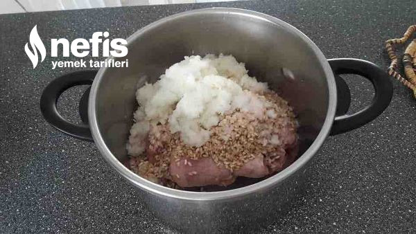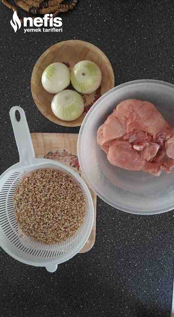 - Tiftiklediğimiz tavuk göğsünü bir tencerenin en altına yerleştirip, üzerine doğranmış soğan ve sarımsağı koyup en üste de haşladığımız buğdayı koyuyoruz.