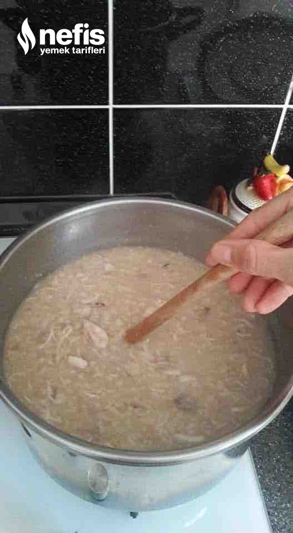 - Tavuğu haşladığımız suyu buğdayın üstünü örtecek kadar döküp tuz ve karabiberini ekleyip kısık ateşte pişmeye bırakıyoruz.