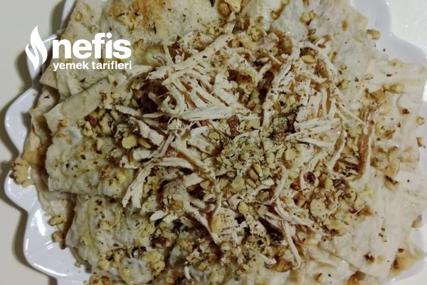 - Ardından çekilmiş ceviziçi serpin tekrar bir sıra daha lavaş ıslatıp tabaktaki lavaşların üzerine dizin.