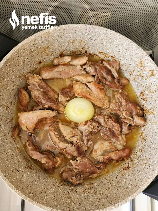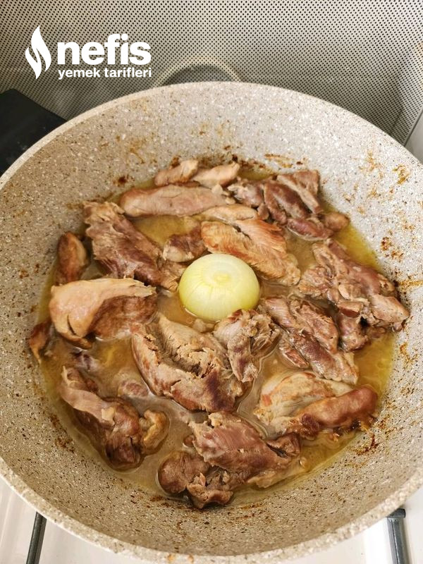- Hafifçe üzeri kızaran etlerimizin ortasına bir bütün soğan yerleştirelim.