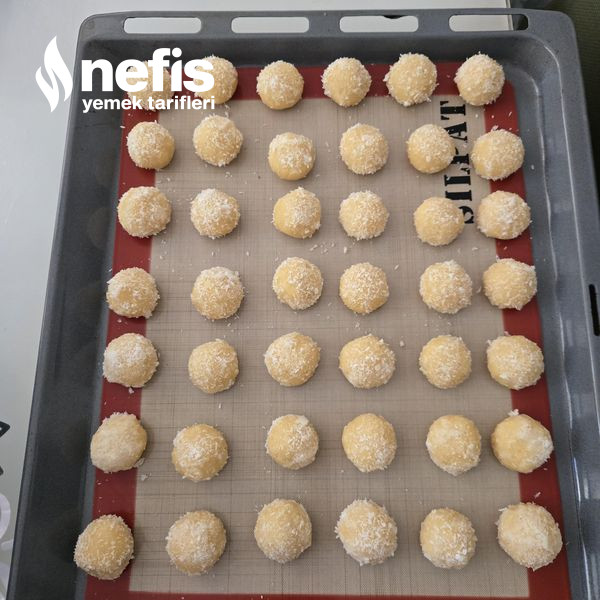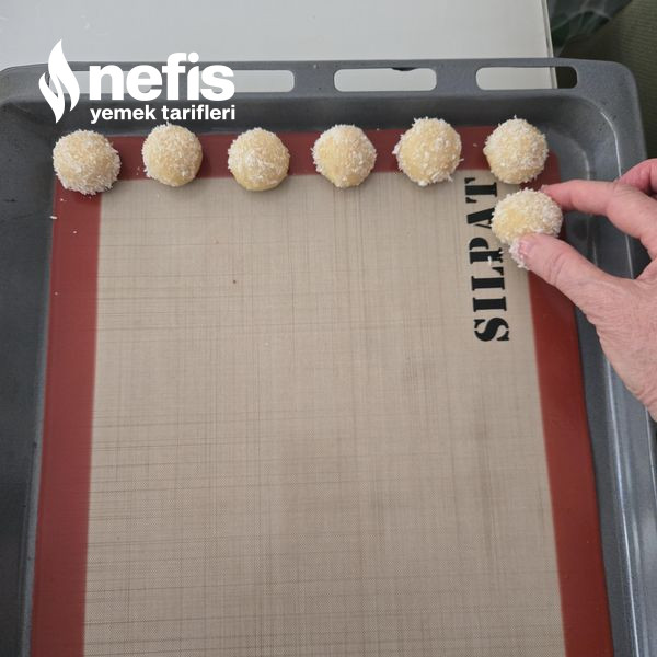 3. Yoğrulan hamurdan küçük modüller koparıp yuvarlayın evvel yumurta akına sonra hindistan cevizine bulayıp aralıklı olarak tepsiye dizin.