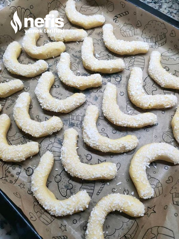 2. Hamur toparlanınca ceviz büyüklüğünde modüller koparıp elimizle fotoğrafta göründüğü üzere uzunlamasına yuvarlayıp, evvel yumurta akına sonrada hindistan cevizi ve şeker karışımına batırıp, yarım ay halinde tepsiye diziyoruz.