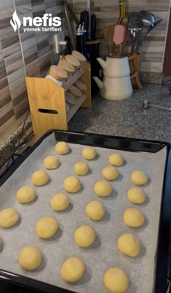 - Ceviz büyüklüğünde toplar yapıp tepsiye dizin.
