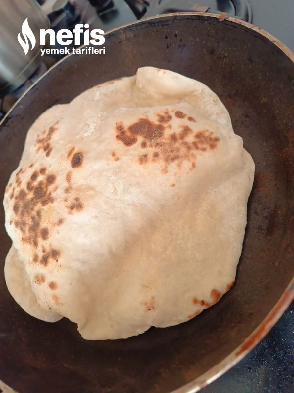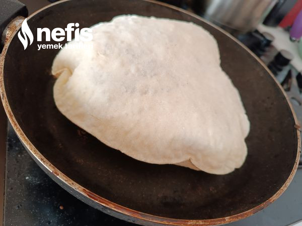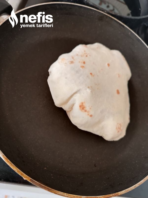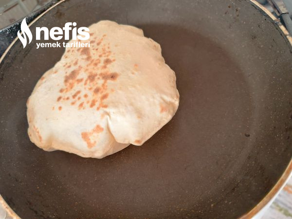 4. Kızgın tavaya alıp üzeri hafif benek benek olunca çevirelim, şişmeye başlayacaktır, biraz şişince tekrar çevirelim, bir iki çevirip hafif kızarınca alalım.