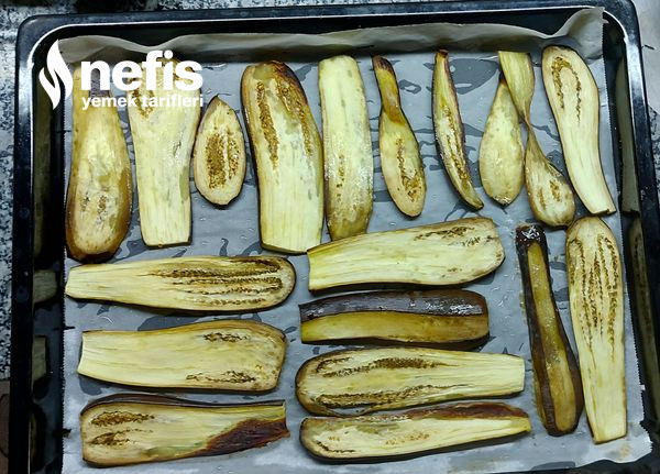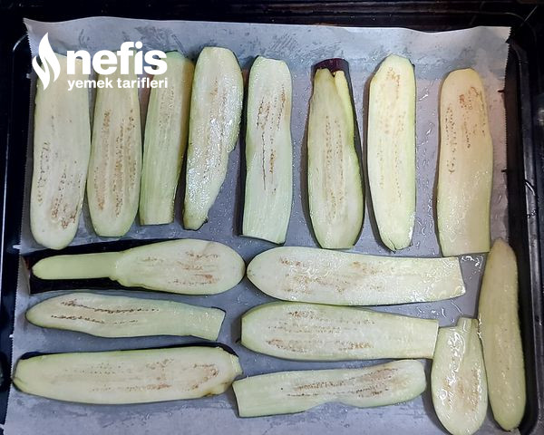 - Patlıcanları uzun ince doğrayalım tuzlu suda biraz bekletelim, suyunu süzüp tepsiye yağlı kağıt koyalım üzerine sıvı yağ biraz tuz serpelim patlıcanları dizip biraz daha sıvı yağ tuz sürelim fırça yada elimizle.
