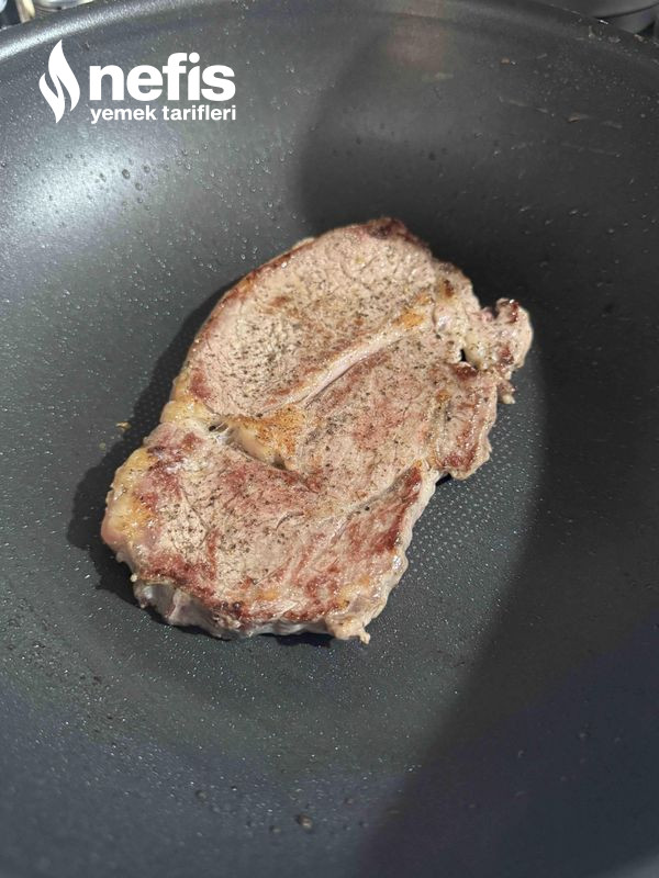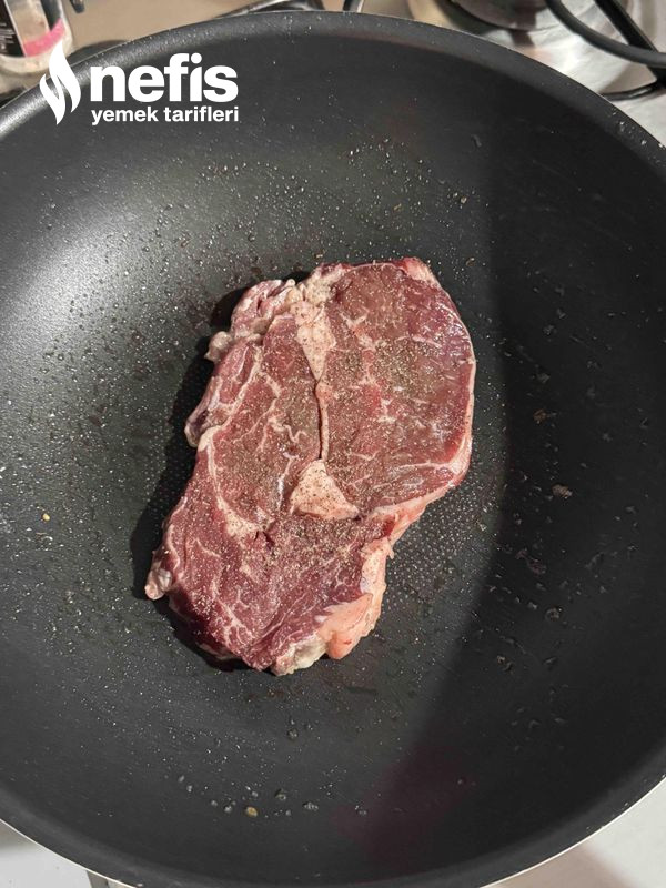 4. Etimiz için; tavaya zeytinyağımızı koyalım ve yüksek ateşte tavayı ısıtalım. Etimizi kızgın tavaya koyalım. Üzerine tuz ve karabiber serpiştirelim. Artlı önlü 5 dakika yüksek ateşte mühürleyerek pişirelim.