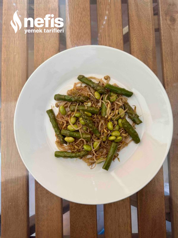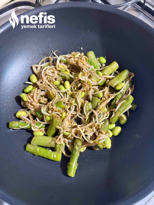 3. Tavamıza zeytinyağı dökelim. Orta ateşte edamame, kuşkonmaz ve soya filizlerini tavaya ekleyelim. İçerisine soya sosumuzu dökerek 3-4 dakika soteleyelim. Soya filizleri noddle kıvamına geldiğinde tabaklayabiliriz.