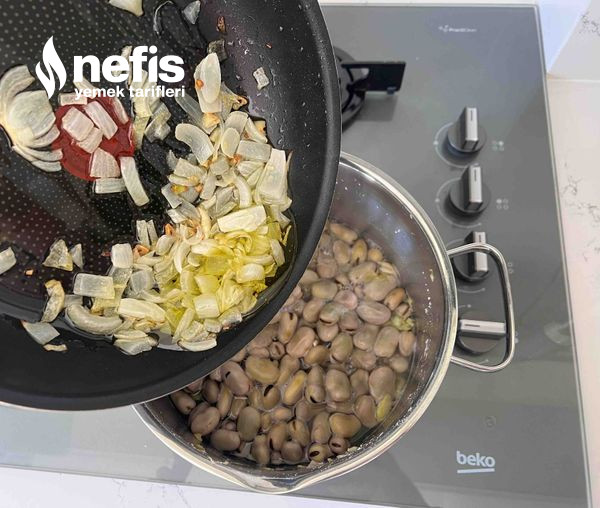 - Haşlanmış baklaların üzerine kavurduğumuz soğan ve sarımsakları döküyoruz. (isteğe bağlı olarak 2-3 yemek kaşığı tahin ekleyebilirsiniz)