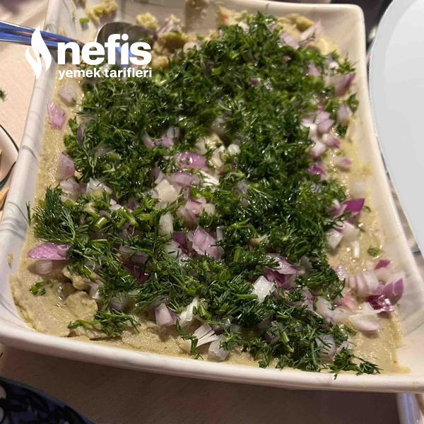 - Servis etmeden birkaç dakika evvel dolaptan çıkardığımız tabağımıza küp küp küçük doğranan mor soğanları ve dereotularını tüm taban üzerine yerleştirip, servise hazır hale getiriyoruz. Hepinize afiyet olsun.