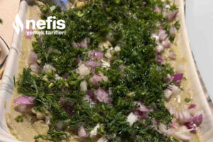 - Servis etmeden birkaç dakika evvel dolaptan çıkardığımız tabağımıza küp küp küçük doğranan mor soğanları ve dereotularını tüm taban üzerine yerleştirip, servise hazır hale getiriyoruz. Hepinize afiyet olsun.