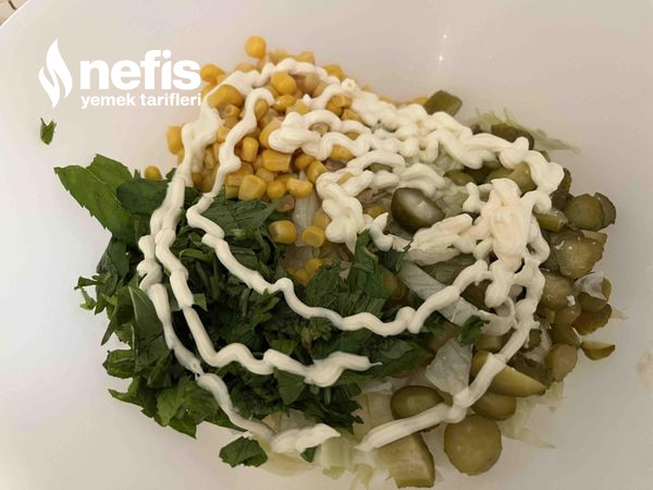 - Mısır eklenir ayrıyeten salatalık turşusu küp küp doğranır.