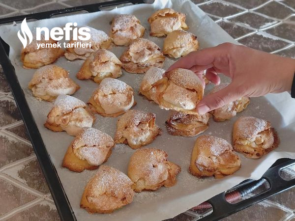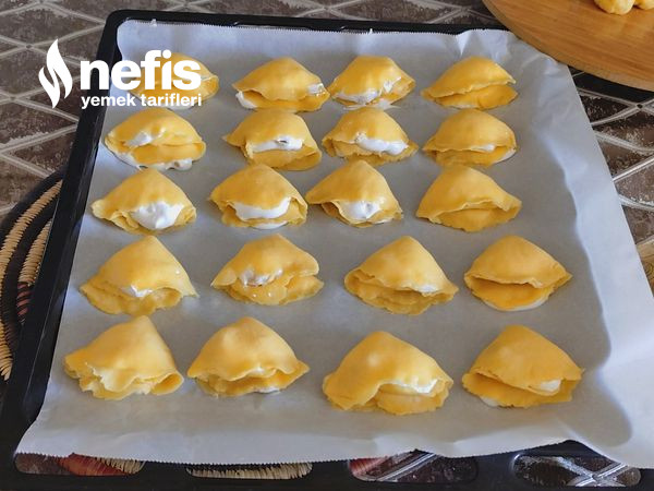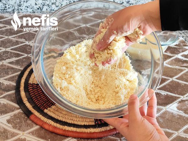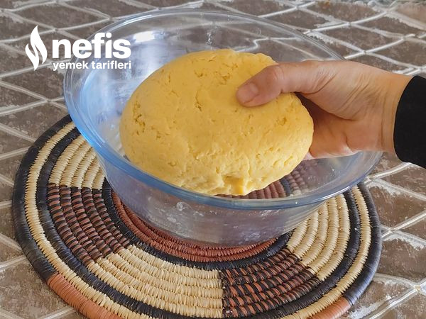 - Üzerine çırpılmış yumurta sarısı–krema karışımını ekleyip yumuşak bir hamur yoğurun.